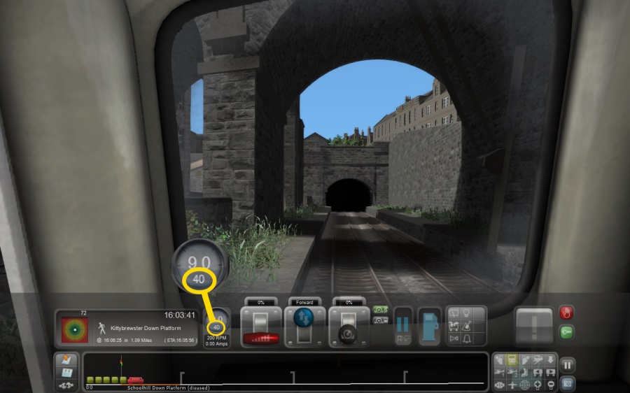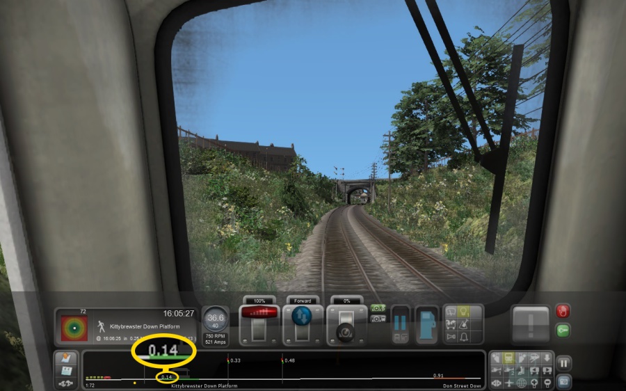 Adjust the brake setting to allow the train to coast in to Kittybrewster station, ensuring the little train in the HUD is fully within the green section, which corresponds to the platform. Alternatively, do it the old fashioned way and look out the window to see where to stop!